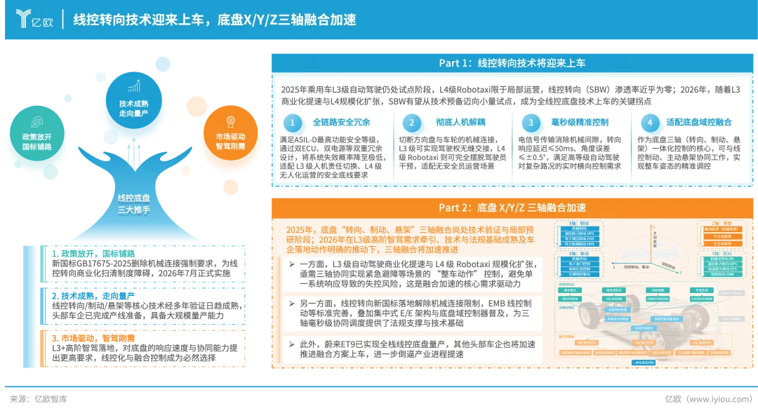 与此同时,底盘三轴转向、制动、悬架的控制系统走向融合,其一体化的协同控制帮助车身在行驶过程中实现更稳定的姿态和更精准的操控反馈。2026年在L3高阶智驾需求牵引、技术与法规基础成熟及车企落地动作明确的推动下,三轴融合将加速推进。