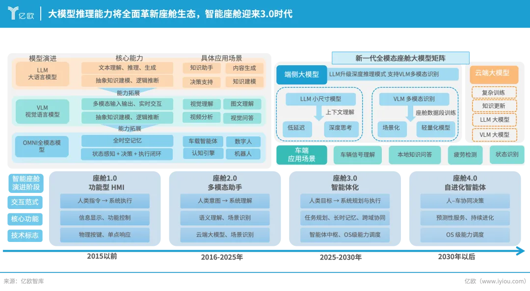 大模型正在向具有推理能力的智能体演进,并推动智能座舱从“交互工具”向“系统级智能体”跃迁,座舱正式进入3.0时代。在这一阶段,座舱不再被动响应指令,而是能够跨域协同多个车内系统,如导航、音乐、空调与驾驶场景联动,主动理解用户目标并提前规划执行路径,形成个性化、可持续优化的服务闭环。其背后的技术底座,是具有理解和推理能力的VLM大模型与OMNI多模态大模型。整体来看,大模型正在重塑智能座舱的能力边界与产品范式,使其成为人车协同决策的关键中枢。