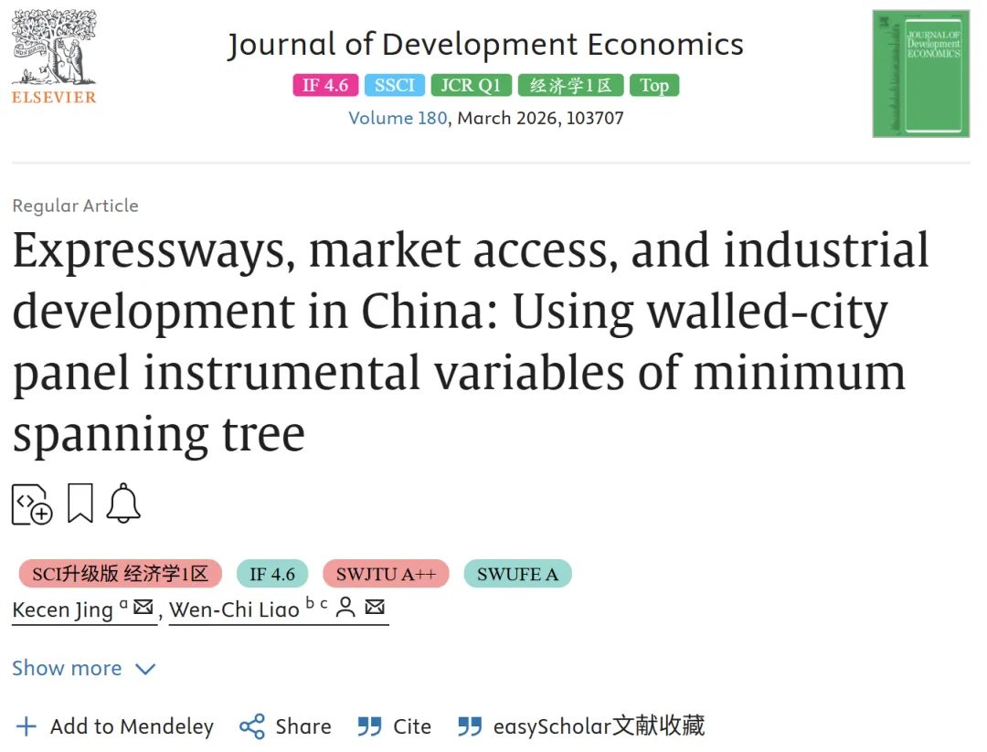 Jing, K. and Liao, W.C., 2025. Expressways, Market Access, and Industrial Development in China: Using Walled-City Panel Instrumental Variables of Minimum Spanning Tree. Journal of Development Economics, p.103707.