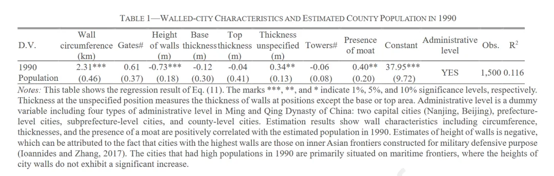Table 1 讲解: 作者跑了一个回归(Eq. 11)。被解释变量是 1990 年县域人口,解释变量是 1820 年的城墙特征。