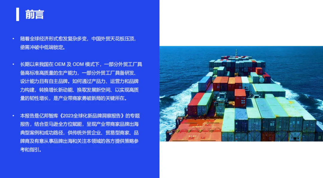 《亿邦智库:2023 产业带品牌出海洞察报告》聚焦产业带出海新趋势,剖析深圳消费电子、晋江鞋业等典型案例,提炼出产品创新、渠道渗透等五大核心能力。报告重点指明亚马逊等平台的赋能价值,为企业提供清晰转型方向。点击《亿邦智库:2023 产业带品牌出海洞察报告》可获取完整版,助力产业带企业向价值链高端跃升!