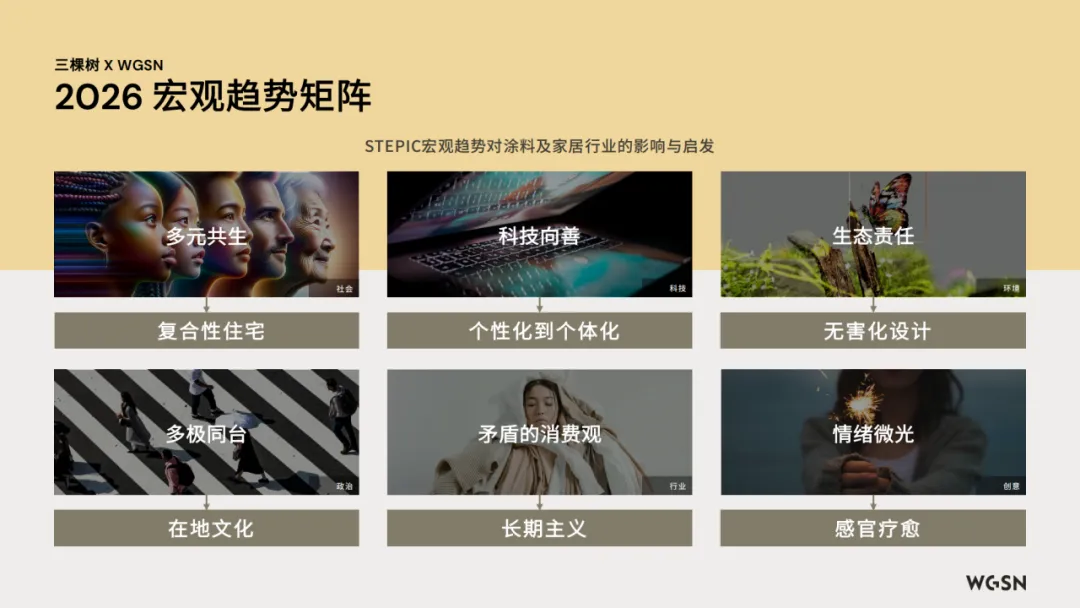 近日,三棵树与 WGSN 联合发布《2026年中国色彩趋势报告》。报告基于 STEPIC 宏观趋势框架,聚焦家居色彩与材料美学,揭示 “文化共鸣、健康优先、科技赋能、情绪疗愈” 的色彩消费新逻辑,为建筑装饰、家居设计等行业提供方向参考。