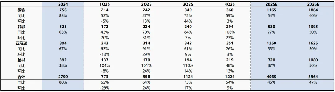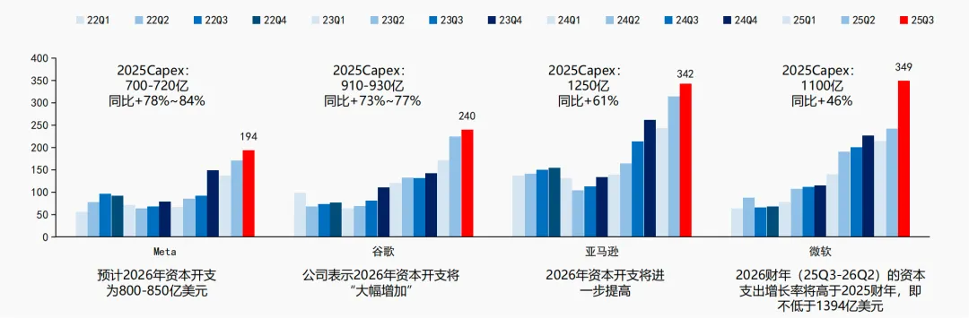 3Q25公司资本开支为342亿美金,同比+61%、环比+9%,且根据电话会议披露信息,2025年Capex指引1250亿美金,则4Q25 Capex预计为351亿美金,且指引2026年资本开支持续增长。
