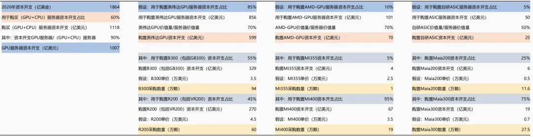 采购AMD芯片:AMD芯片快速迭代发展,MI400系列芯片性能表现出色,预计2026年微软将采购部分AMD芯片作为补充,此处假设采购AMD GPU服务器资本开支占比为10%,且用于购置MI355、MI400资本开支占比分别为5%、95%,且假设MI355、MI400芯片单价分别为2.5、3.5万美金,对应MI355、MI400采购量分别为1、19万颗。