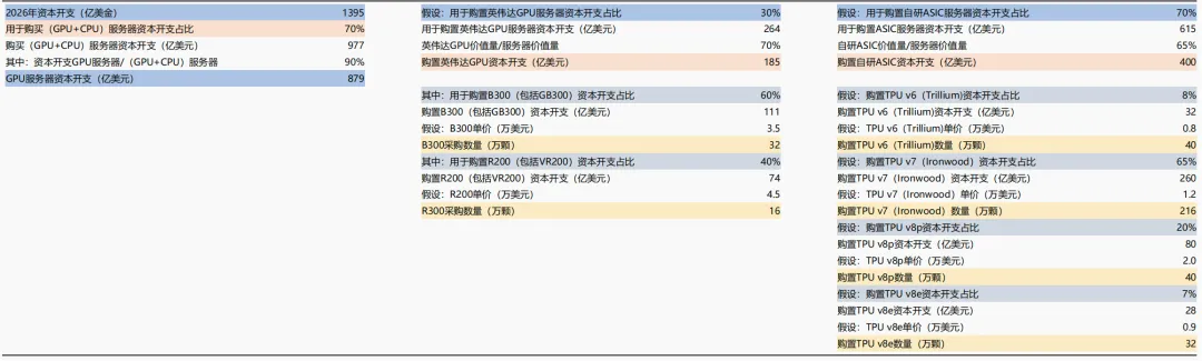 采购英伟达芯片:谷歌采购英伟达芯片主要供云客户使用,假设2026年采购英伟达GPU服务器资本开支占比30%,AI芯片占服务器价值量为70%,对应英伟达GPU芯片价值量为185亿美金,分别假设采购英伟达B300(包括GB300)、R200(包括VR200)资本开支占比为60%、40%,假设B300、R200单价分别为3.5、4.5万美元,对应B300、R200采购量分别为32、16万颗。