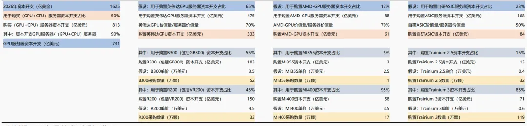 GPU服务器资本开支:根据前文测算,2026年资本开支为1625亿美金,根据亚马逊3Q25电话会披露数据,其资本开支主要由AI基建和电商物流基建驱动;我们假设用于购买GPU、CPU服务器的资本开支占比为50%,且GPU服务器在其中占比为90%(由于GPU服务器ASP大幅高于CPU服务器),则2026年用于购买GPU服务器的资本开支为731亿美金。