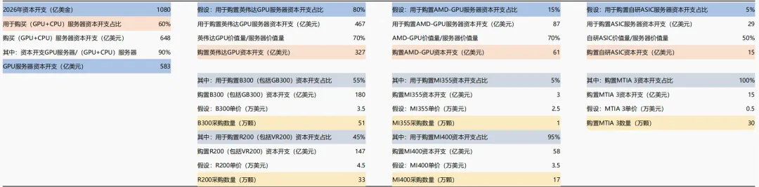 采购英伟达芯片:考虑到芯片性能、运行稳定性、兼容性等维度,Meta仍以采购英伟达芯片为主,假设2026年采购英伟达GPU服务器资本开支占比为80%,AI芯片占服务器价值量为70%,对应英伟达GPU芯片价值量为327亿美金,分别假设采购英伟达B300(包括GB300)、R200(包括VR200)资本开支占比为55%、45%,假设B300、R200单价分别为3.5、4.5万美元(考虑到性能提升、HBM及晶圆成本提升等因素),对应B300、R200采购量分别为51、33万颗。