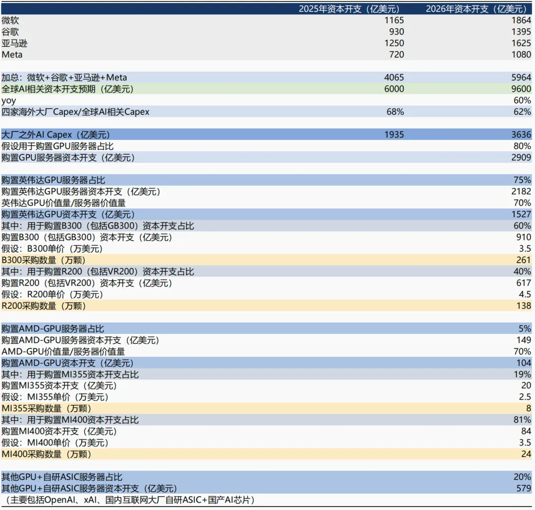 采购英伟达芯片:考虑到英伟达芯片稳定性好、生态成熟,目前全球其他厂商仍以采购英伟达芯片为主,假设2026年采购英伟达GPU服务器资本开支占比为75%,AI芯片占服务器价值量为70%,对应英伟达GPU芯片价值量为1527亿美金;考虑到R200系列服务器前期调试难度较大,以头部云厂商采购为主,所以假设其他厂商分别假设采购英伟达B300(包括GB300)、R200(包括VR200)资本开支占比为60%、40%,假设B300、R200单价分别为3.5、4.5万美元(考虑到性能提升、HBM及晶圆成本提升等因素),对应B300、R200采购量分别为261、138万颗。