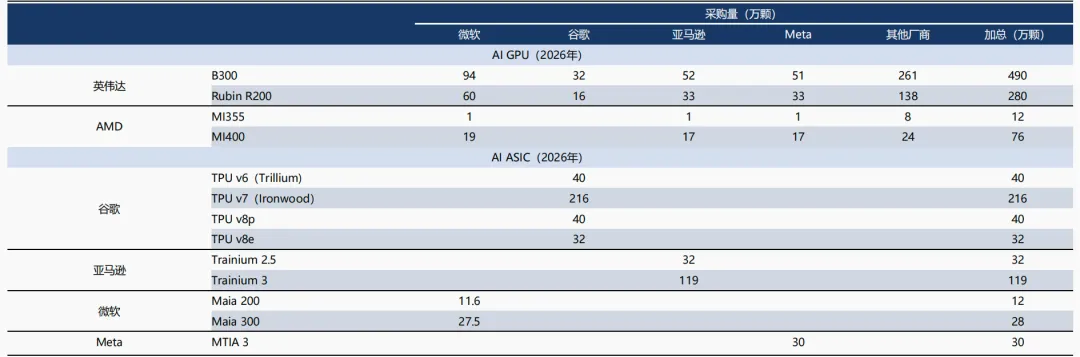 英伟达:2026年各厂商仍以英伟达芯片采购为主,根据上文测算结果,预计2026年英伟达芯片出货量一共770万颗,其中B300为490万颗(包括GB300系列),R200为280万颗(包括Rubin VR200系列)。