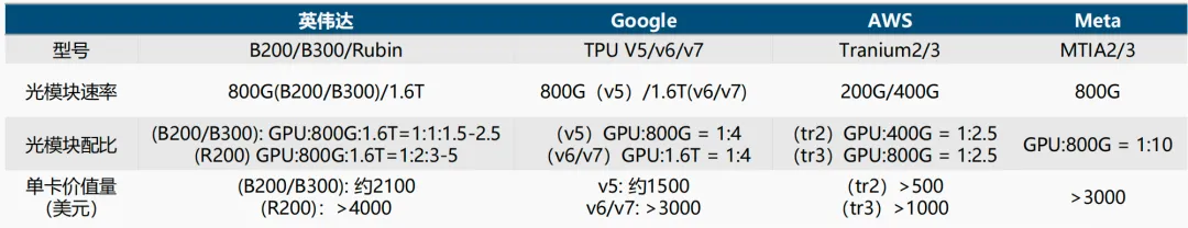 价值量变化:单张AI加速卡对应的光模块价值量已进入千美元级(例如B200/B300约2100美元,更高代际方案可>4000美元;TPU v6/v7与Meta MTIA2/3亦在3000美元以上),光互连在单柜/单Pod里的投入代际翻倍增加。