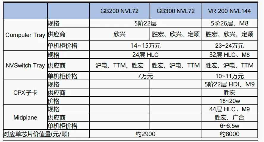 1)Computer Tray仍包含两块类似GB300的Bianca板,预计规格为5阶26层HDI,单机柜23~24万元;