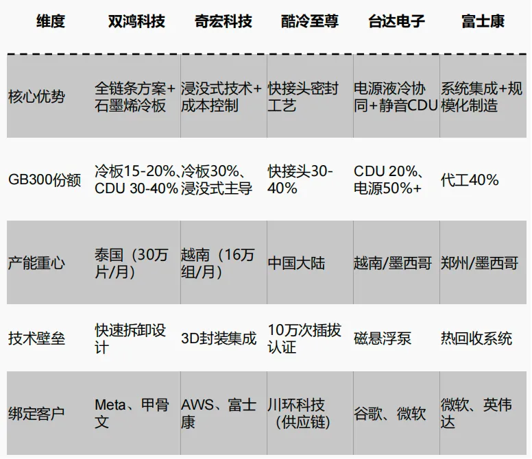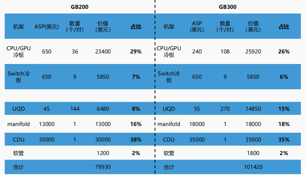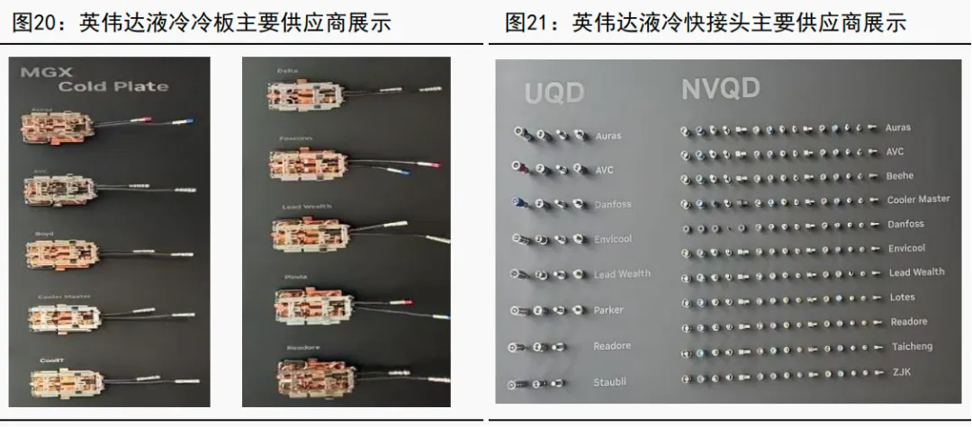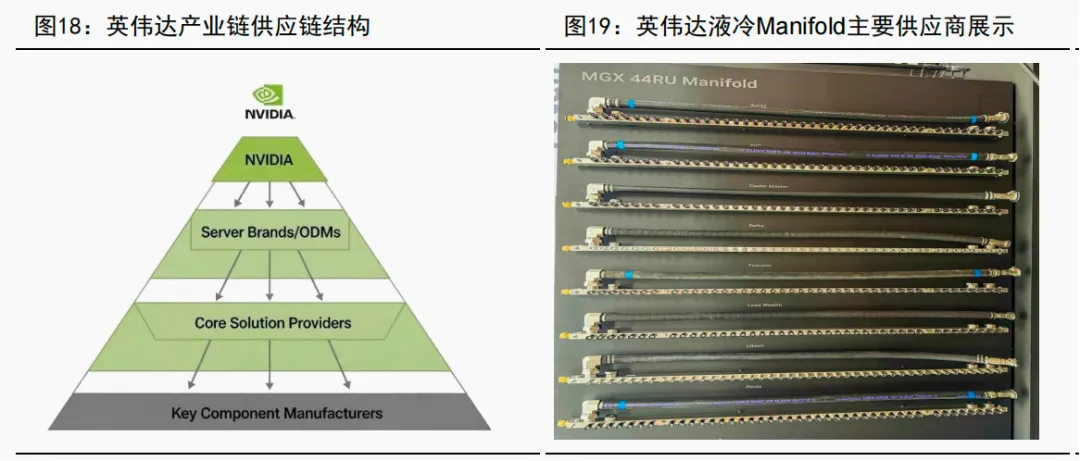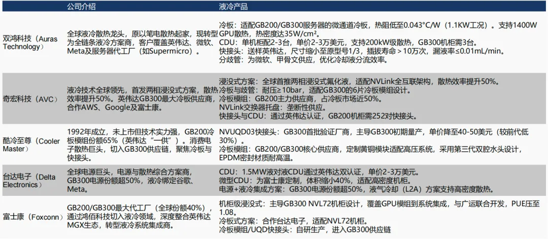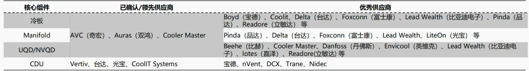 英伟达冷板、NVQD、Manifold等柜内零部件基本由AVC、CoolerMaster、双鸿供应,尤其是AVC和CoolerMaster在价值量较高的冷板环节占据主要份额。