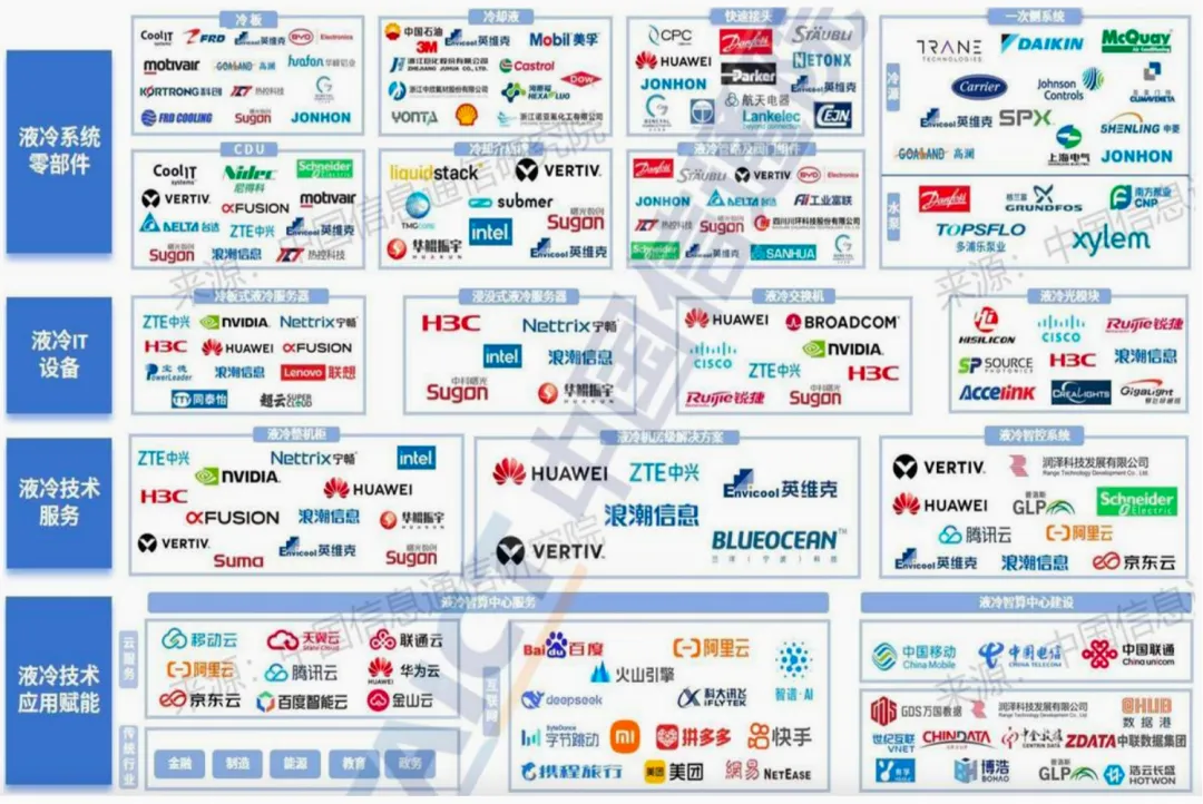 全球AI发展趋势下,国内液冷供应商包括服务器、互联网厂商、温控设备商以及零配件公司均有参与,各自环节有各自的优势: