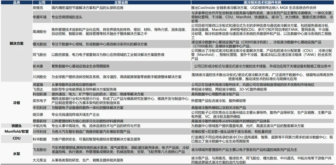 图33:我国液冷产业链主要上市公司主营业务和相关液冷技术布局
