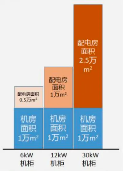 根据ODCC测算,在机房面积为1万m2的场景下,单机柜功率若从6kW提升至30kW,则配电房面积将从0.5万m2提升至2.5万m2,配电房将侵占数据中心大部分土地空间。
