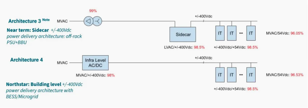 2024年10月,谷歌在 OCP(Open Compute Project)大会上介绍了应用于 AIDC 的±400Vdc 供电架构,其过渡期采用专用电源柜(Sidecar)方案,终极目标是将±400Vdc与电池备份整合至数据中心基础设施,与微电网、储能等结合,实现能效最大化(>96.5%)和计算密度跃升。