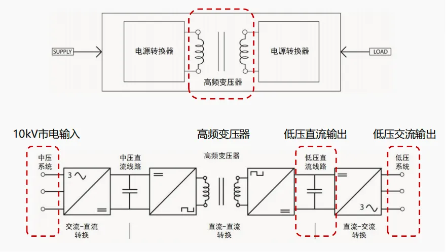 固态变压器(SST)由电力电子变换器和高频变压器组成,可实现高压交流至低压直流/交流的电压变换及能量双向流动。