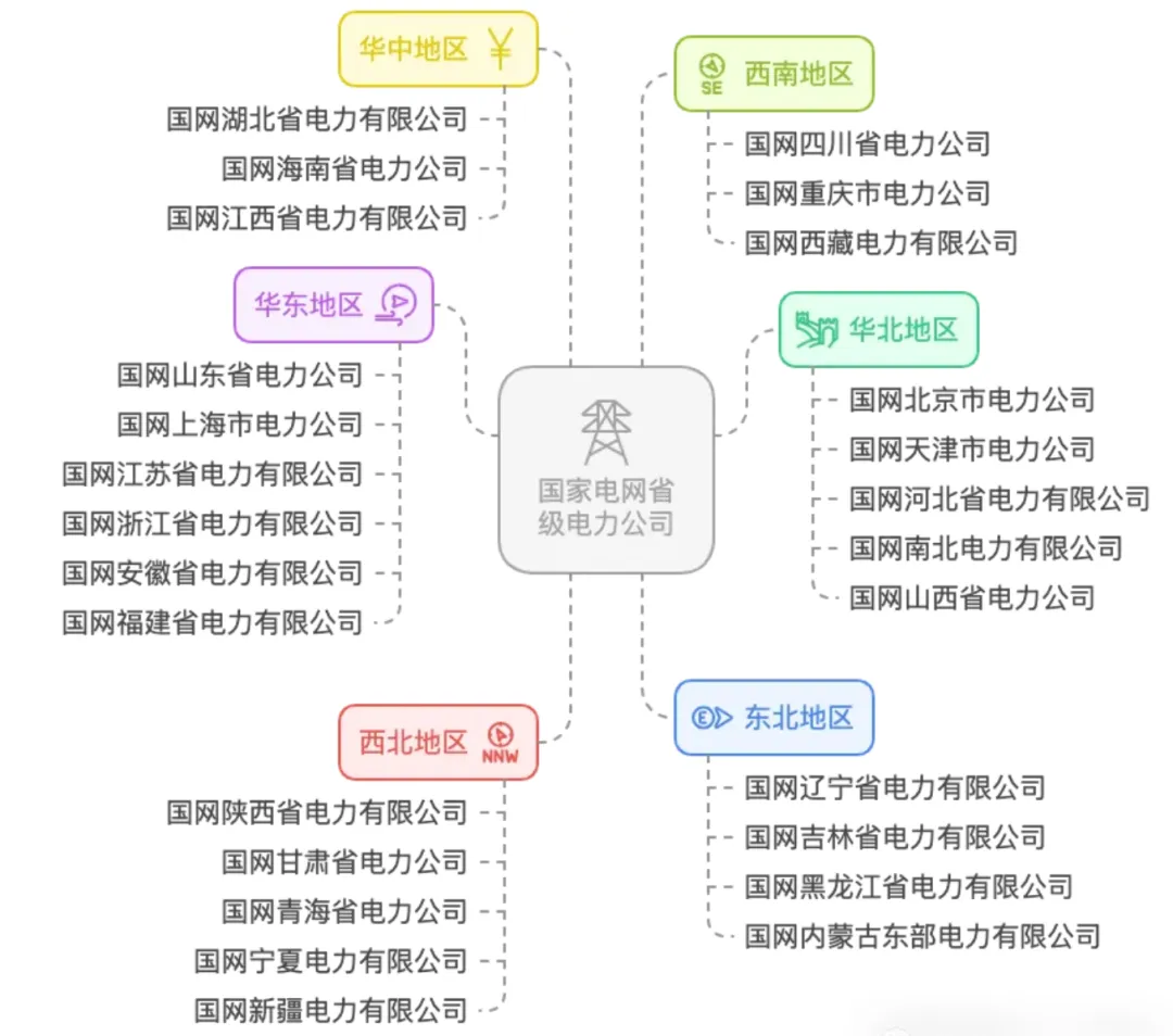 国家电网主要通过下属的27家省级电力公司承担对应行政辖区内的供电工作,各省级电力公司下辖的各地供电局等承担更具体的日常工作,主要包括电网的计划调度、输电线变电所的检修维护、面向C及B端的供电及客户服务等。