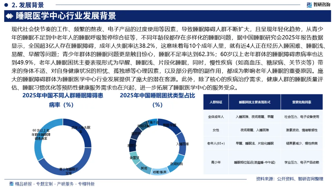 行业发展有利因素:现代社会快节奏的工作、频繁的熬夜、电子产品的过度使用等因素,导致睡眠障碍人群不断扩大,且呈现年轻化趋势,从青少年的睡眠不足到中老年人的睡眠呼吸暂停综合征等,不同年龄段都存在多样化的睡眠问题,据中国睡眠研究会2025年报告数据显示,全国超3亿人存在睡眠障碍,成年人失眠率达38.2%;青少年群体的睡眠问题更是触目惊心,睡眠不足率达到62.3%;60岁以上老年群体的睡眠障碍患病率也达到49.9%,庞大的睡眠障碍群体为睡眠医学中心行业发展提供了庞大的潜在客源。