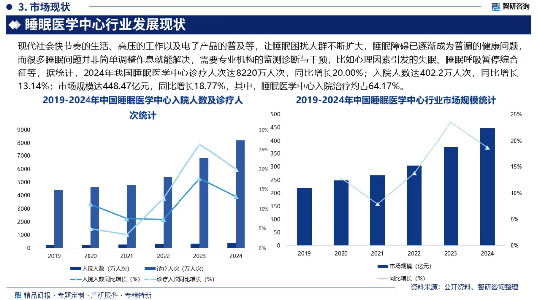 市场规模:现代社会快节奏的生活、高压的工作以及电子产品的普及等,让睡眠困扰人群不断扩大,睡眠障碍已逐渐成为普遍的健康问题,而很多睡眠问题并非简单调整作息就能解决,需要专业机构的监测诊断与干预,比如心理因素引发的失眠、睡眠呼吸暂停综合征等,据统计,2024年我国睡眠医学中心诊疗人次达8220万人次,同比增长20.00%;入院人数达402.2万人次,同比增长13.14%;市场规模达448.47亿元,同比增长18.77%。