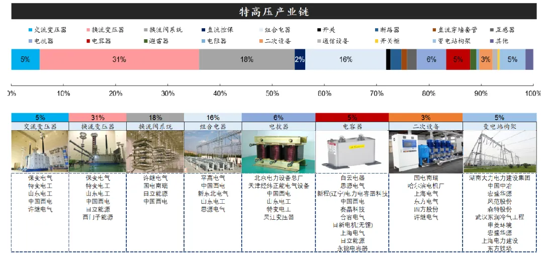 中游环节:细分为直流特高压和交流特高压两个部分,涵盖换流阀、控制保护、换流变压器、GIS、特高压变压器等多种关键组件。此外,中游还涉及电缆、架空导线、电缆连接件和铁塔等输送端缆架产品,特变电工、长缆股份和宏盛华源等公司均在该领域有所布局。