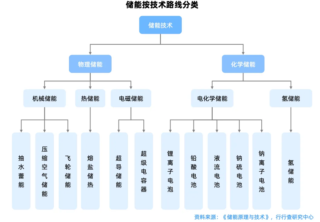 新型储能分类:主要分为电化学储能、机械储能、电磁储能、热储能和氢储能等几大类别。