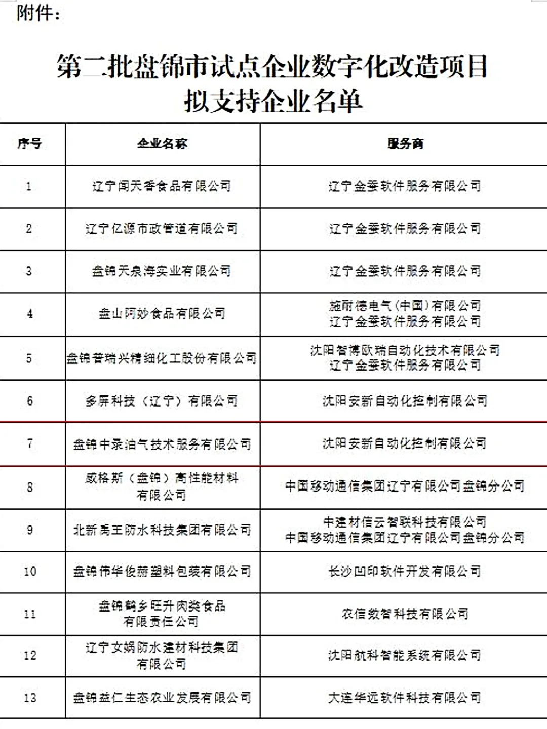 近日,从盘锦市工业和信息化局传来喜讯,盘锦中录油气技术服务有限公司凭借在数字化转型领域的扎实积淀与创新实践,成功获批盘锦市中小企业数字化转型城市试点专项资金支持。这份荣誉不仅是对公司深耕产业数字化升级的高度认可,更是政企协同推动产业数字化发展的生动写照。