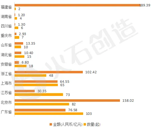 2025年,国内融资活动在地域分布上较为集中。从融资项目数量看,广东省以全年103起融资事件位居第一,北京(82起)和江苏(73起)次之。从融资金额看,福建省以189.39亿元排名首位,占总融资金额的28.81%;北京和浙江紧随其后,融资金额分别为158.02亿元和102.42亿元,位列第二、三位。