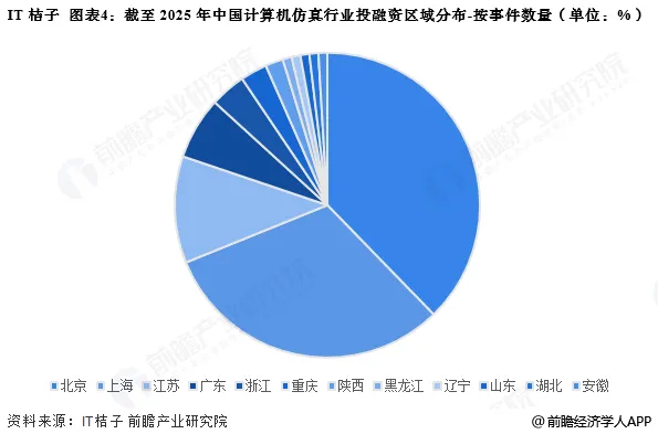 从计算机仿真行业的企业融资区域来看,目前北京的融资事件最多,截至2025年11月,累计融资事件达到40起,上海融资事件数量排名第二,为33起。同时,江苏、广东、浙江等地的计算机仿真投融资活跃度也较高。