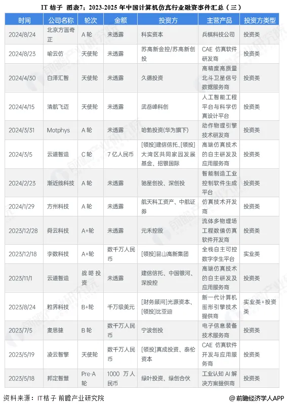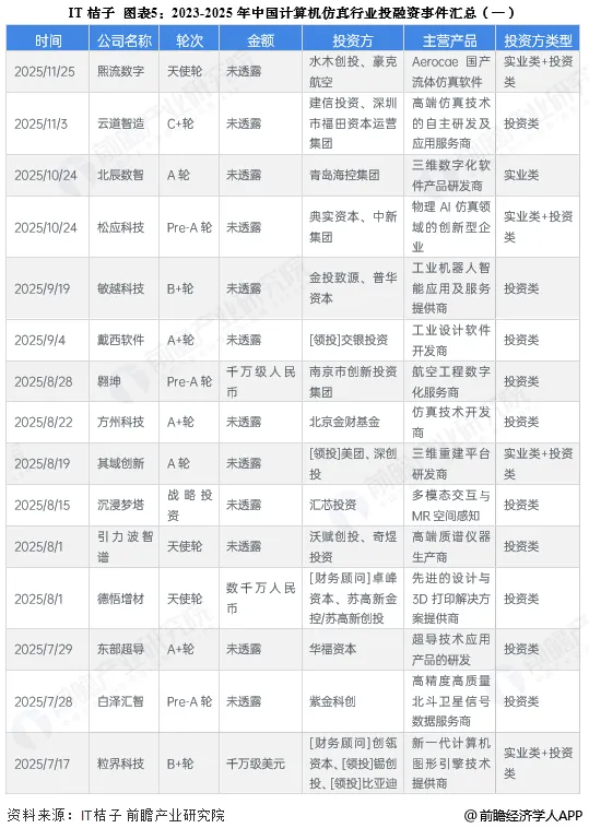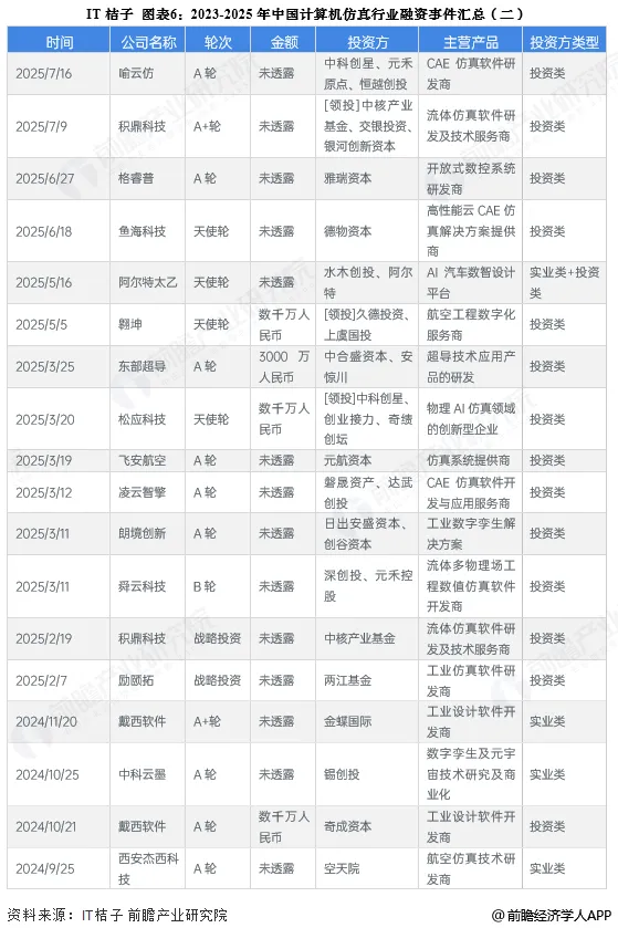 根据IT桔子,2016-2025年期间,我国计算机仿真行业共发生了108起融资事件,投融资活跃度呈波动上升态势。2024年,计算机仿真行业披露融资金额的事件共有12起,共计8.73亿元。2025年截至12月1日,计算机仿真行业投融资事件共有30起,共计约8.89亿元。