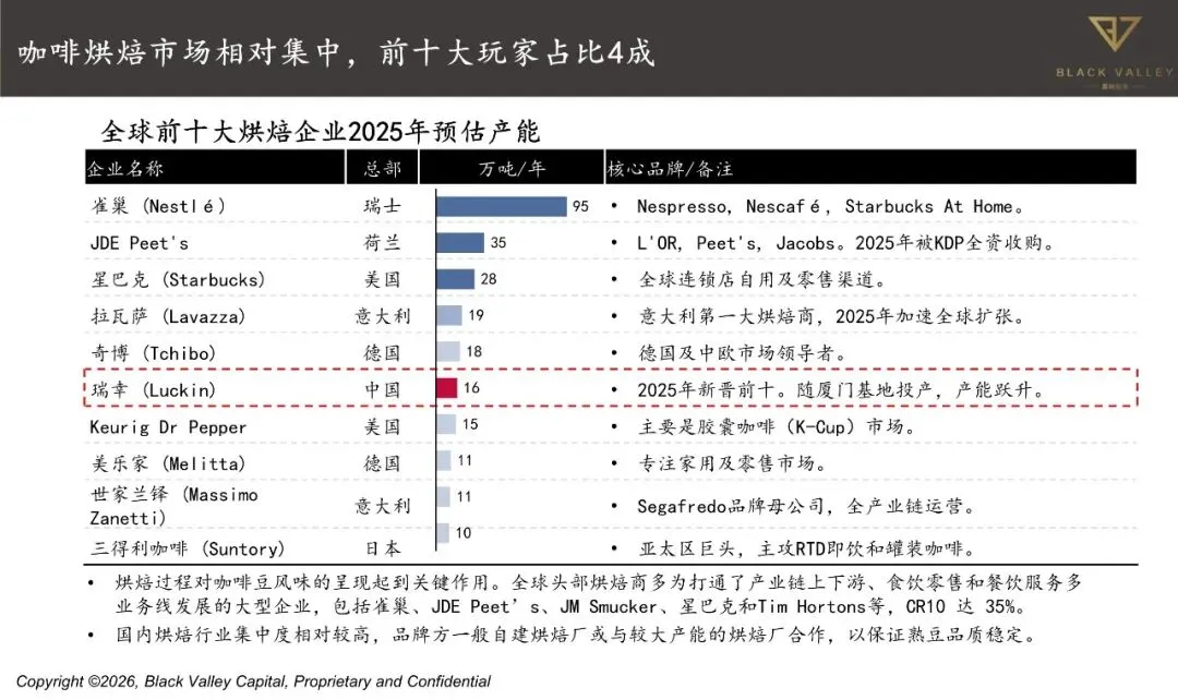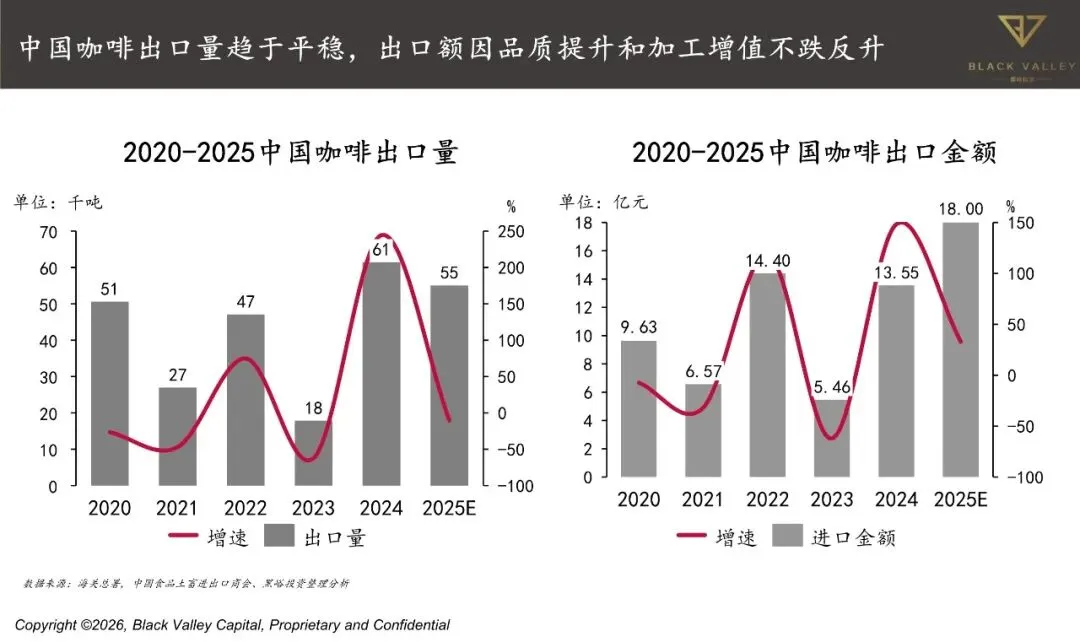 种植端提质:云南咖啡产区精品率突破30%,瑰夏、铁皮卡等精品品种种植面积大幅增加,推动产值提升。 烘焙与加工:头部品牌如瑞幸自建烘焙基地,厦门创新产业园年产能达5.5万吨,总产能跻身全球前十,强化供应链控制。 技术融合:AI应用与功能性咖啡兴起,如益生菌、胶原蛋白添加,反映健康化趋势;智能烘焙系统提升效率。