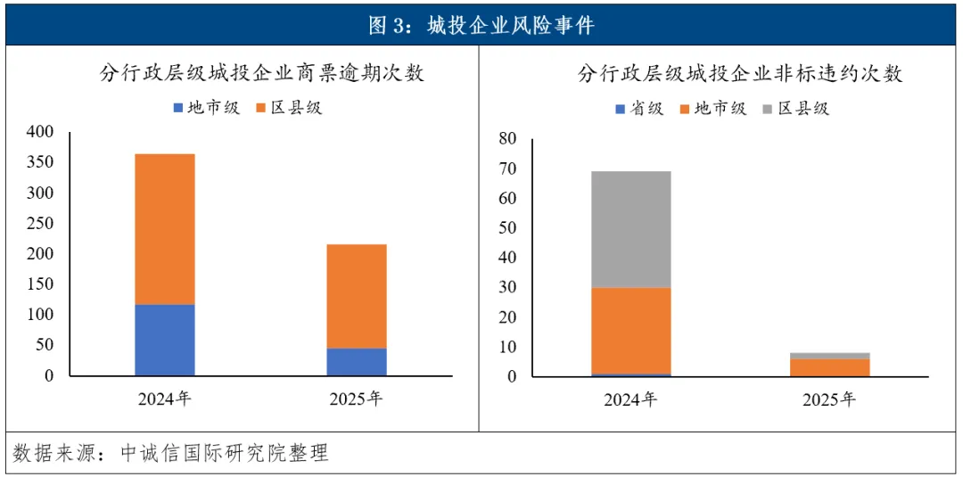 长期以来,城投企业商票逾期、非标违约均以市县级为主,省级城投较少发生风险事件,2025年则进一步向区县级集中,但部分区域呈现“向上蔓延”态势。2025年城投非标违约和商票逾期共发生224次,较2024年减少48.27%,仍以区县级为主,商票逾期和非标违约数量合计达173次,占比77.23%,较2024年上升约11.41个百分点,区县级城投企业债务压力相对更大,或与地方债务置换持续推进、区域资源可能更倾向于省级和地市级以避免引发市场大幅波动等有关。值得关注的是,部分区域地市级城投企业风险事件占比较高,2025年信阳市、洛阳市分别有8次、7次地市级主体发生商票逾期或非标违约,数量明显高于其余区域,其中信阳市较2024年新增7笔地市级风险事件,洛阳市地市级主体风险事件占比较2024年增加47个百分点至77.78%,一定程度上反映出这些地区城投企业信用风险有所扩散、呈现“向上蔓延”态势。在信用风险持续暴露的冲击下,市县级主体融资环境恶化,存量债务滚续压力陡增,被迫将有限的现金流用于债务偿还,极易导致转型资源投入不足,直接延缓甚至停滞市场化转型进度。