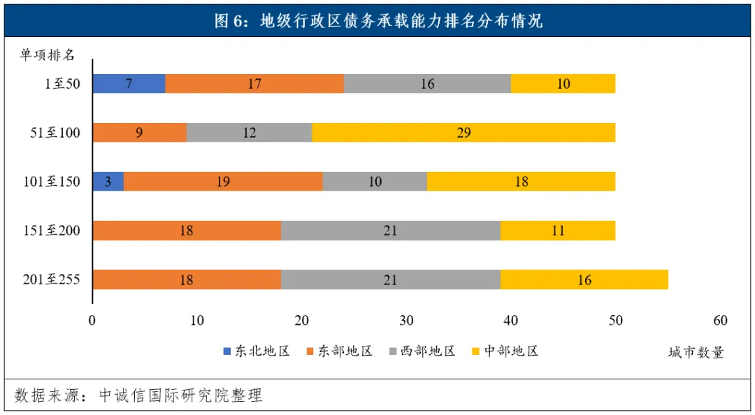 债务承载能力方面,东部地区因化债约束尾部城投企业风险释放,西部省会城市偿债能力较弱。具体来看,东部地区城投企业债务规模随发展需求与融资便利快速扩张,但在隐债严监管基调持续下融资渠道收紧,债务压力逐步凸显,区域内风险事件增多,2/3的城市排在100名之后。东北地区偿债指标整体表现较好,七成的城市排在前50名,主要系当地发债城投企业数量较少、债务负担较轻,随着化债持续推进,城投企业债务结构和偿债能力有所改善,主要体现在有息债务占总资产的比例和长期债务与营运资金比率下降、EBITDA利息保障倍数上升。中部地区整体排名高于东部地区但低于东北地区,46.43%的城市排在前100名以内,150名以后的城市主要来自于河南省,主要系与偿债能力相关的财务指标表现不佳以及部分城市城投企业信用风险事件发生较多。西部地区排名以上升为主但整体靠后,过半数城市排名在150名以后,尤其是昆明、乌鲁木齐、贵阳等省会城市债务承载能力排名垫底,主要是当地城投企业短期偿债能力较弱、流动性风险较高,同时信用风险事件的发生也对区域债务承载能力产生一定负面影响。