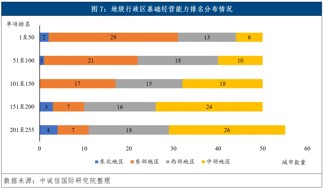从地级行政区城投企业综合发展指数排名上看,东部地区持续领跑其他地区。东部地区[2]凭借沿海区位条件和成熟的产业结构,经济和财政基础较为坚实,当地城投企业履行公益性职能可获得相对稳定的政府回款支持,同时在市场化业务拓展方面也更具资源与潜力,超六成的城市排名在前100以内,其中广东、江苏、浙江、山东等头部经济大省占比较高。西部地区[3]发展不均衡问题仍然突出,成都、西安、南宁这三个省会城市和个别资源强市排在50名以内,超六成的城市排名在150名之后。中部地区[4]整体排名高于西部地区,六个省会城市排名均在前50名以内,过半数城市排名在100-200名之间,区域发展水平存在梯度差距,整体相对均衡。东北地区[5]城市数量较少,排名前60的城市为大连、沈阳、长春、哈尔滨,其他城市排名均在150名及之后。