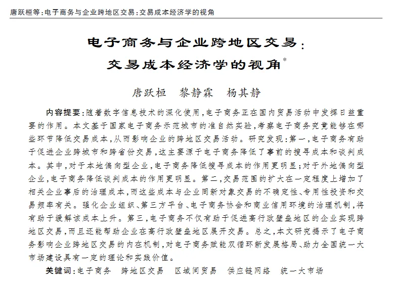 中国社会科学院的唐跃桓与中国人民大学经济学院的黎静霖、杨其静共同撰写文章《电子商务与企业跨地区交易:交易成本经济学的视角》,在《经济研究》2025 年第 1 期发表。