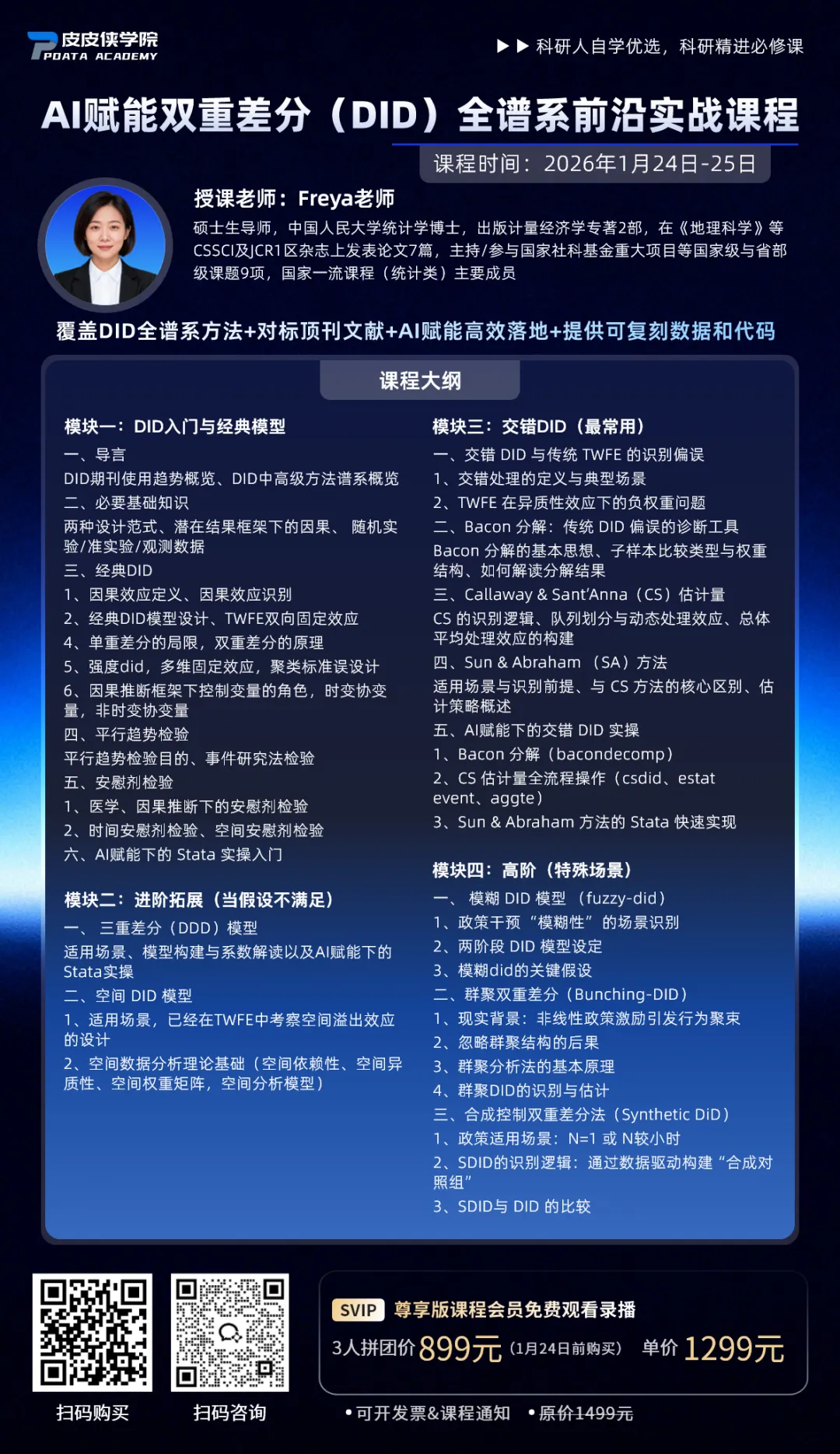 我们面向科研学者推出《AI 赋能双重差分(DID)全谱系前沿实战课程》,课程打破 “碎片化学习” 困境,既夯实经典 DID 的理论根基与实证规范,更聚焦近年顶刊高频前沿方法:深度拆解三重差分、空间 DID、交错 DID、模糊 DID、群聚 DID、合成控制 DID 等进阶技术,系统讲解 Bacon 分解、动态处理效应估计、合成对照组构建等关键前沿工具。全程贯穿《中国工业经济》《经济研究》《世界经济》等顶级期刊最新实证案例,融入 AI 赋能的 Stata 全流程实操技巧,让学习者既能精准把握因果推断的前沿逻辑,又能快速攻克 “假设不满足”“特殊场景适配” 等研究痛点,高效落地政策评估、效应识别等各类实证研究,轻松接轨顶刊研究范式。