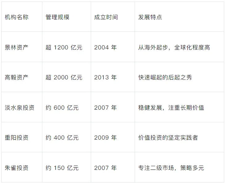 景林资产是五家机构中成立最早的,具有 20 年的发展历史。其发展特点是从海外市场起步,早期主要服务海外机构投资者,具有较高的国际化程度。高毅资产虽然成立时间最短,但发展速度最快,在短短 10 年内就成为行业规模最大的私募机构。淡水泉和朱雀投资成立时间相近,都经历了中国私募基金行业的完整发展周期。重阳投资则是在 2009 年成立,错过了 2007 年的牛市,但正好赶上了价值投资理念在中国的兴起。