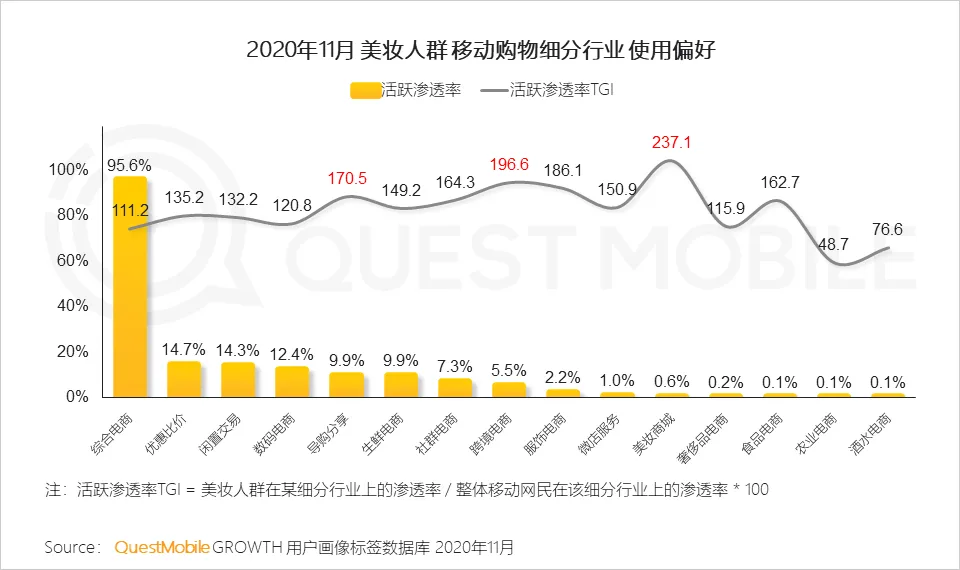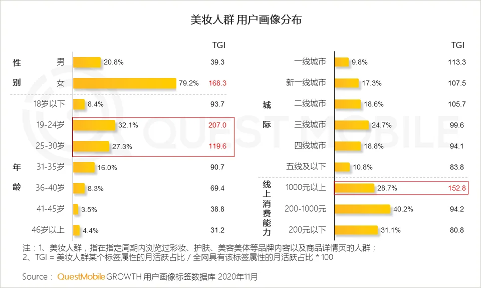 本篇跟大家分享一下美妆行业营销态势,2020年11月,“双十一”+“黑五”又拉动了一波消费行情。QuestMobile数据显示,关注美妆品牌背后的人群主要是30岁以下的年轻女性,这部分人群购买力强劲,线上消费能力在千元以上用户占到了28.7%,TGI高达152.8。