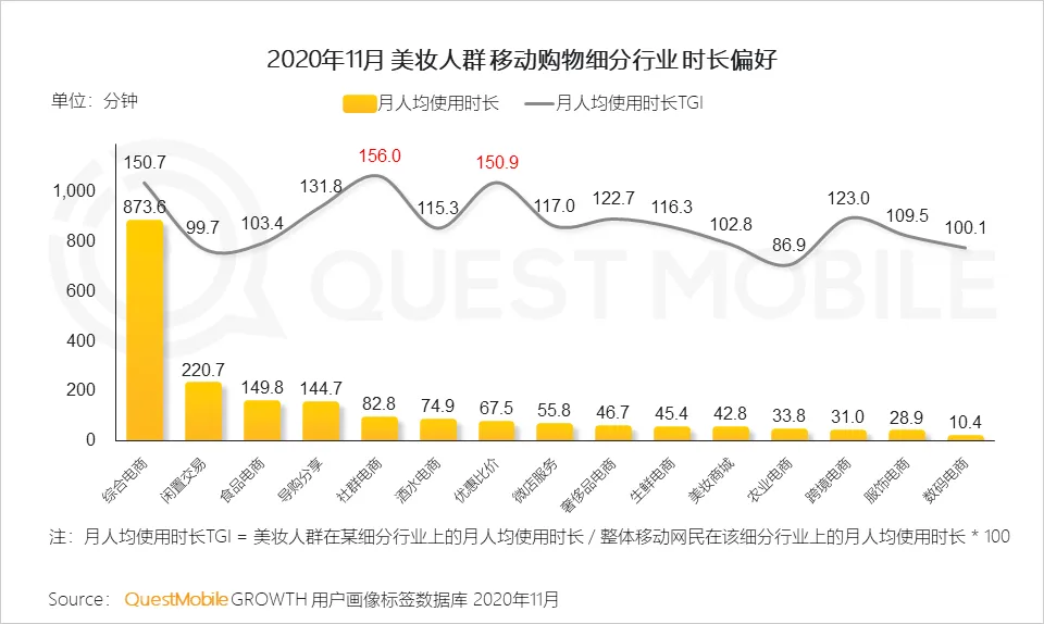 3、 在APP端,美妆人群除综合电商外,在社群电商、优惠比价类应用的使用时长偏好显著,显示出“货比三家”的消费习惯
