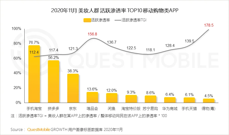 4、美妆人群在各类购物APP的TGI均高于大盘用户,显示出强劲的购买力,其中对于得物(毒)和唯品会的偏好更明显