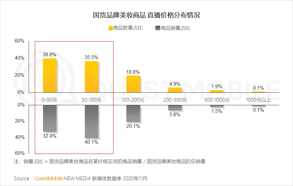 但是在营销的另一个战场——直播电商中,国货品牌悄然发力已经显示了效果:首先是上架商品数量最多,直播玩儿的最嗨;其次是在一些热门品类上,比如说面膜、精华,能够跟欧美品牌分庭抗礼;第三是在价位上,百元内性价比产品直接对抗欧美品牌的200-500元中高端产品……