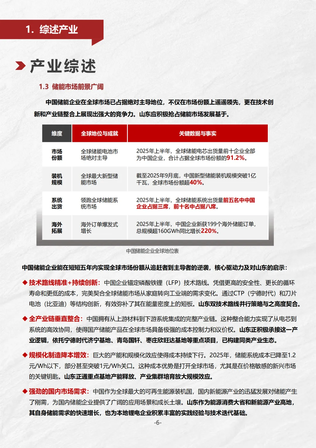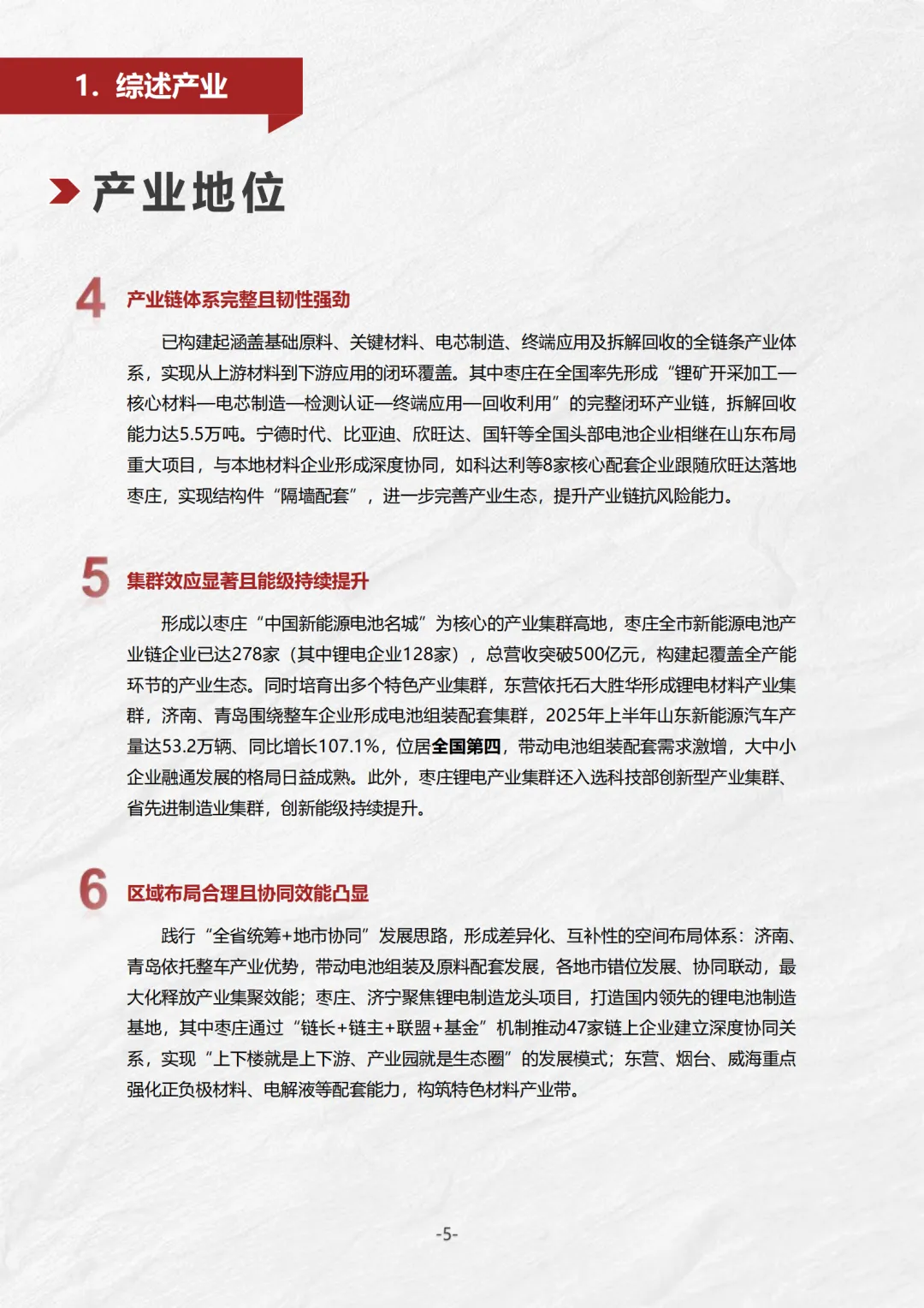 产业地位稳固,在全国竞争格局中优势突出。关键材料领域,电解液、隔膜等产量占全国 10% 以上,石大胜华全球碳酸酯溶剂市场份额超 40%。集群效应显著,形成以枣庄 “中国新能源电池名城” 为核心的产业高地,济南、青岛、济宁等重点地市差异化发展、协同联动。龙头企业集聚,宁德时代、比亚迪、欣旺达等头部企业重大项目落地,带动本土配套企业协同发展,形成强大产业生态。