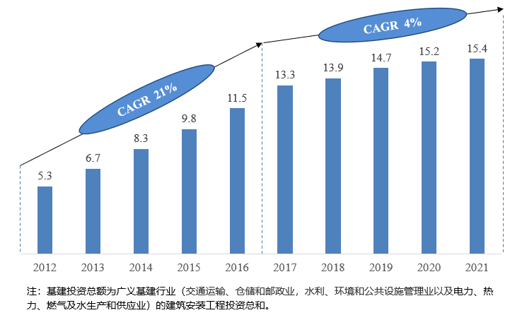 图2 2012-2021年基建投资总额及增长情况(万亿)