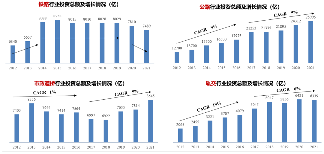 图3 铁路、公路、市政道桥、轨交行业投资总额及增长情况