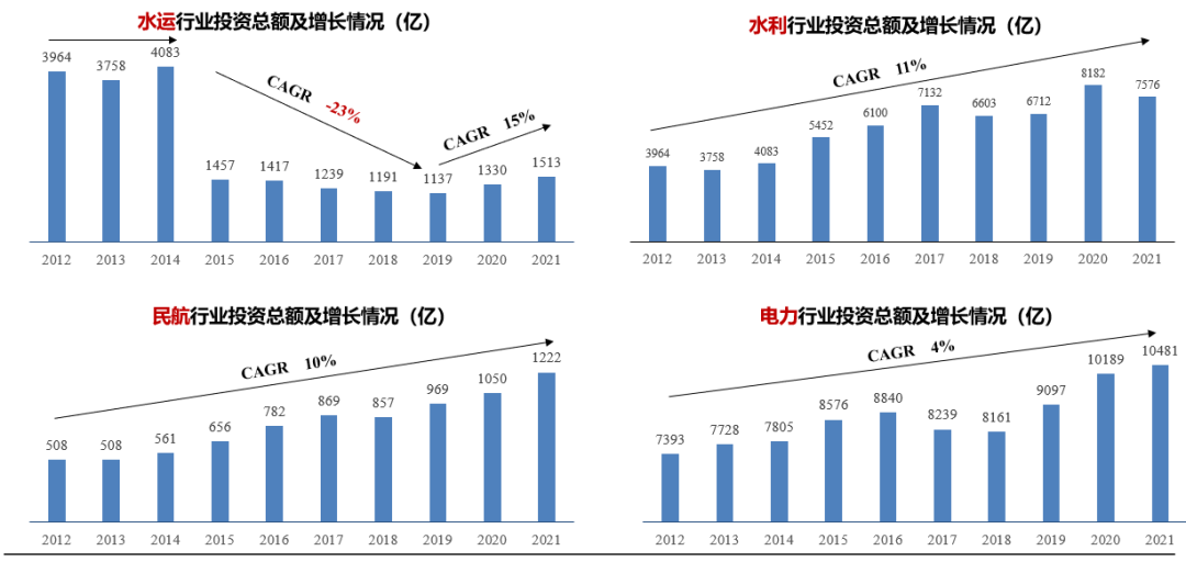 图4 水运、水利、民航、电力行业投资总额及增长情况