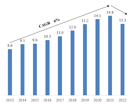 房地产行业总的投资,过去10年里面(2013年-2021年)复合增长速度是6%,到2022年下降了10%(图1)。