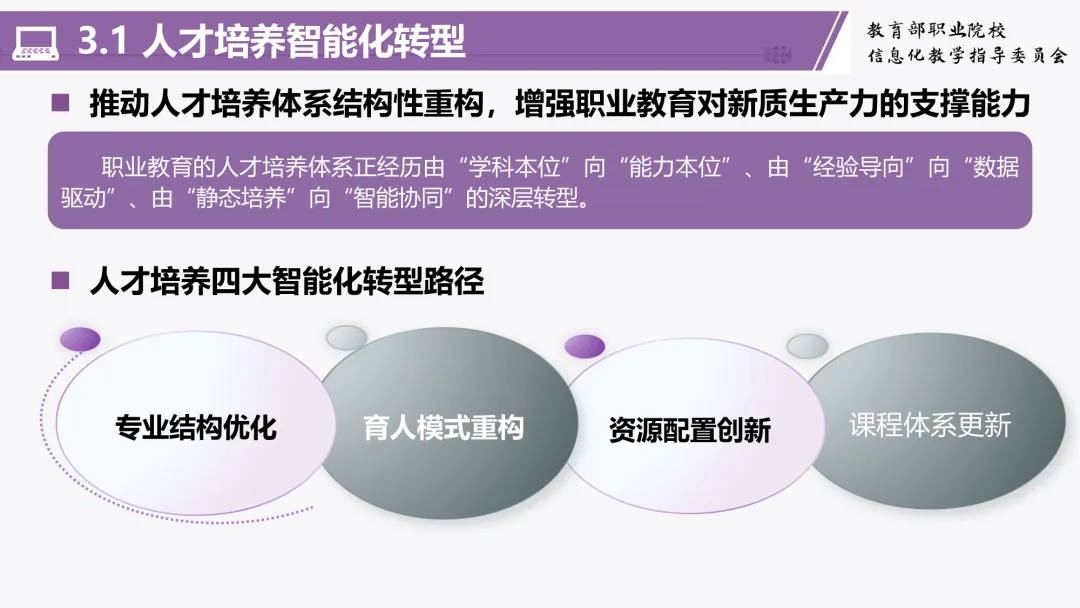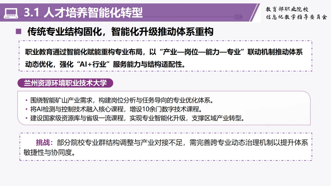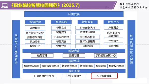 韩教授指出,在国家与学校两个层面,教育数字化与智能化已成为核心政策导向。国家正大力推进智慧教育公共服务与数字治理体系建设,而学校则聚焦于数智化人才培养与校园数字治理。他重点解读了团队编制的《职业院校人工智能应用指引》与《职业院校智慧校园规范》,强调了构建人工智能时代高技能人才培养新体系的重要性,并特别指出了“人工智能基座”在智慧校园基础支撑中的核心地位。