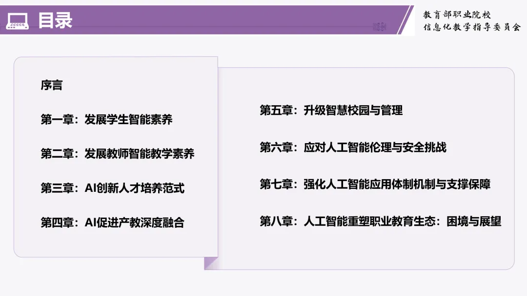 该报告作为《中国智慧教育区域发展报告》的重要组成部分,由清华大学教育学院刘英群主编,旨在精准把握当前我国职业教育人工智能应用的现状、问题与需求,提炼实践中的典型经验与案例。报告内容详实,体系完整,共分为八个章节,系统性地探讨了职业教育在人工智能时代的机遇与挑战: