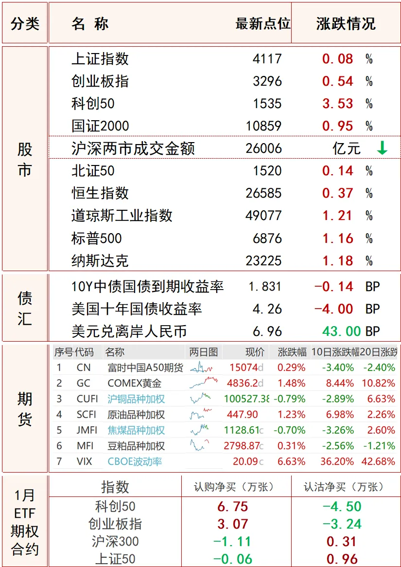 2、格陵兰岛危机峰回路转。美国总统特朗普宣布,已与北约秘书长吕特就格陵兰岛问题达成协议框架。如果这项方案最终得以落实,将对美国和所有北约成员国都大有裨益。特朗普表示,将不会实施原定于2月1日生效的关税措施。受此消息影响,美股直线拉升,三大股指均涨超1%;现货白银跳水,一度跌超4%。欧盟委员会发言人表示,欧盟领导人紧急峰会将按计划于当地时间1月22日晚间举行。