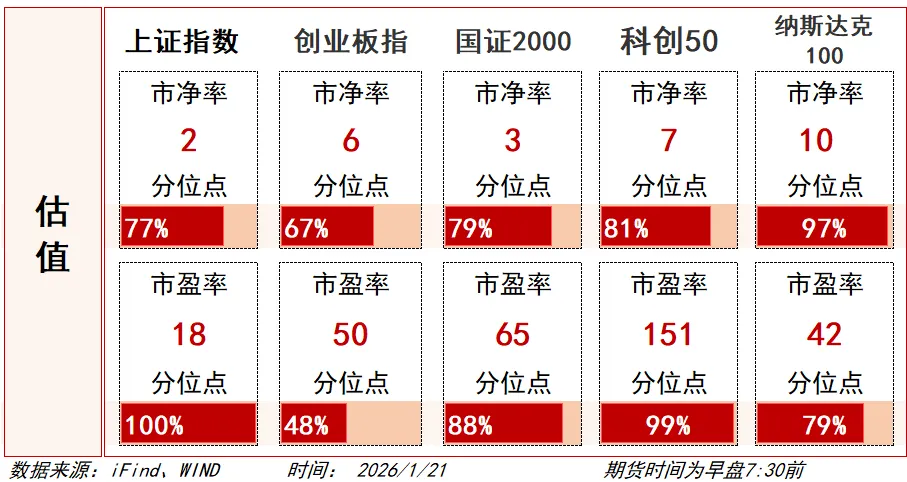 半导体产业全线爆发,龙芯中科、大港股份、江化微、通富微电等个股涨停,灿芯股份、海光信息、澜起科技、利扬芯片等个股涨超10%。消息面上,近期美光科技表示,因AI基础设施建设需求激增,内存芯片短缺状况持续,高端半导体供应紧张。同时,先进封装技术重要性凸显,成为提升算力关键环节。此外,近期多只半导体个股披露业绩预告,如芯碁微装2025年净利同比预增71.13%-83.58%,通富微电2025年净利同比预增62.34%-99.24%等再度验证半导体行情周期复苏。从市场角度来看,资金对于半导体产业链认可度持续提升,其领涨细分从此前设备、存储芯片等个别细分,开始向先进封装、算力芯片等方向扩散。但半导体相关个股大多以震荡向上的趋势性行情为主,在昨日集体放量拉升后,是否存在足够的资金承接或是今日的观盘重点之一。